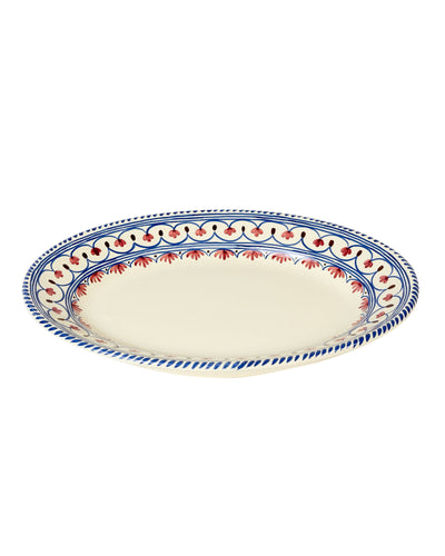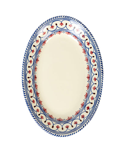 A playful yet elegant scallop and floral design, hand-painted by talented artisans in Spain. The Honor serving platter is one to display out on the table, even without food!  A truly unique piece in a rich colour palette of pink, blue and chestnut brown, style it with our pink Vine tablecloth and large Heather bowl. Dishwasher and microwave safe.