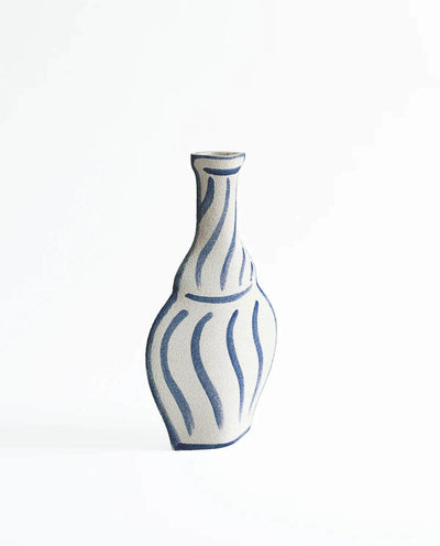 Crafted by our designer, the underglazes are meticulously applied by hand before the initial firing, infusing the vase with a touch reminiscent of traditional figurative art. After a second firing at 1250°C, a transparent glaze is added to the interior for a refined finish, ensuring lasting durability. As each piece is artisanal, decorative patterns and shapes may vary subtly, highlighting the authenticity that defines our craftsmanship. DETAILS: - Stoneware fired at high temperatures, finished with a glossy transparent glaze on the interior. - Raw exterior showcasing the natural texture of the clay, harmoniously paired with hand-painted underglaze motifs. DIMENSIONS: H: 32 CM / L: 20 CM H: 12.6 INCH. / L: 7.9 INCH.
