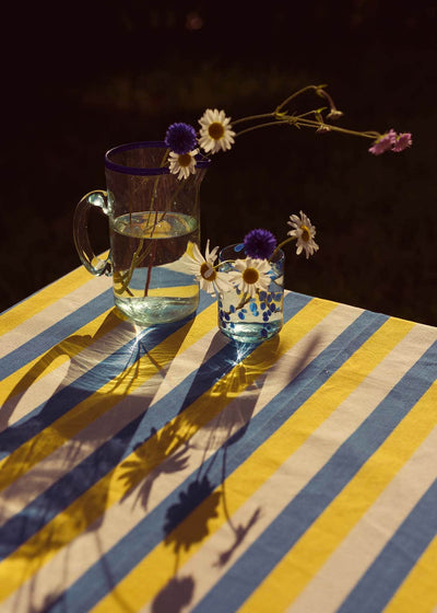 Hand-blown Claro jug with blue rim, mouth-blown by glass artists in the Balearic Islands. Satisfyingly weighty, it’s hard to know whether to put flowers in them or whip up a batch of something refreshing involving rum.