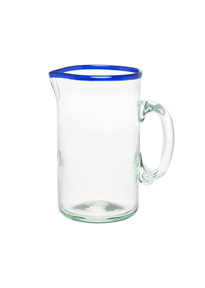 Hand-blown Claro jug with blue rim, mouth-blown by glass artists in the Balearic Islands.