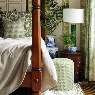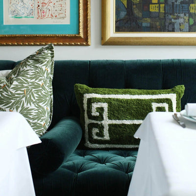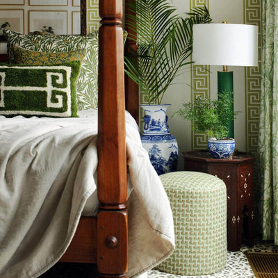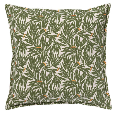 Yoko’s classic bamboo pattern is inspired by an antique piece of fabric that once embellished a French estate and screen printed on the cushion by master printers from India and shows fine detail work of orange leaves embroidered on the cushion.
