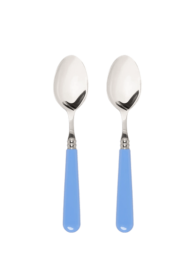 A set of 2 stainless steel dessert spoons with a sky blue handle.