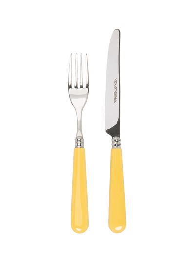A colourful knife and fork stainless steel cutlery set with a butter yellow handle.