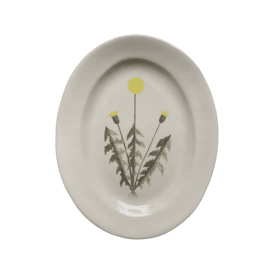 Stoneware platter made by hand from a slab of white clay. Shaped over a mould, cut and smoothed with a rubber kidney. Fired once when dry, painted by hand using stains and oxides and fired again to fix. The piece is then signed, waxed, and coated in a transparent glaze and placed back in the kiln for one final 1230 degree centigrade firing.