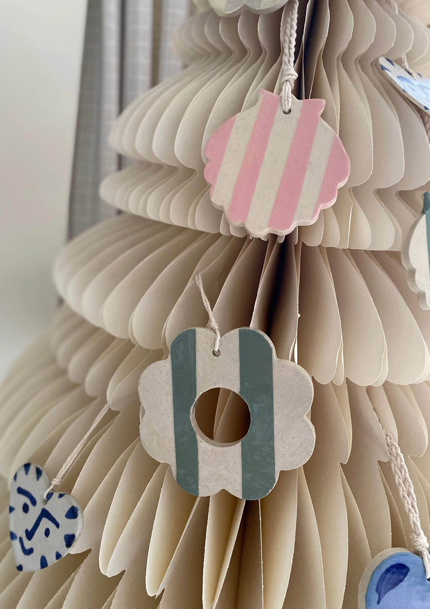 The Duci stripe flower Hanging decoration in Green, handmade from Staffordshire stoneware and painted with coloured slips. Available in pink, red, blue, green and yellow.