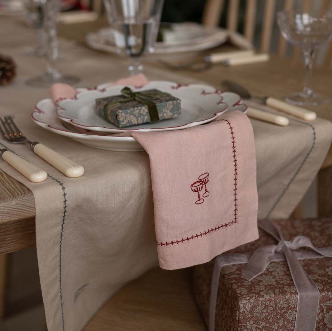 Complete your Christmas dinner tablescape with this set of 4 100% Linen napkins. This set includes 4 Pink Plaster colour Napkins with a delicate hemstitched trim and playful embroidery motifs.
