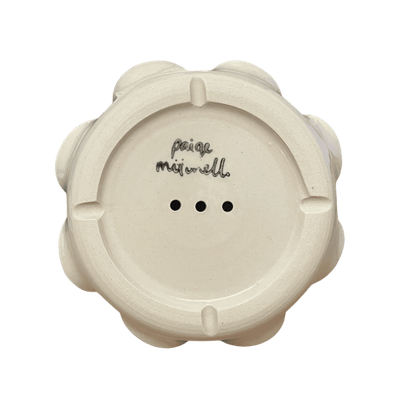 Soap dish thrown on the wheel by hand using white stoneware clay. A foot ring is turned into the base and drainage holes are added. Bisque fired to 1000 degrees when dry, stamped, waxed and coated in a glossy transparent glaze. The piece is then placed back in the kiln for its 1230 degree centigrade glaze firing. A transfer of Paige's sketchbook drawings are then cut and individually placed onto the piece and smoothed into place. The piece is then put back into the kiln for its third and final firing.