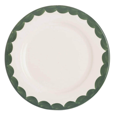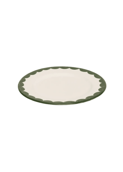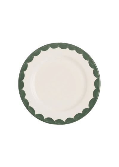 Hand-painted green scallop side plates. With designs inspired by the 'fajalauza' ceramic tradition of southern Spain, Late Afternoon's dinnerware sets speak of sunshine, long lunches and 'sobremesa': the Spanish word for the conversation over the table after a meal with family and friends. Made in Portugal by artisans, in the long tradition of Iberian ceramics. 20cm side plate or cake plate with a well, hand-painted using toxin-free glazes. Full matching set of dinner plates and bowls available.