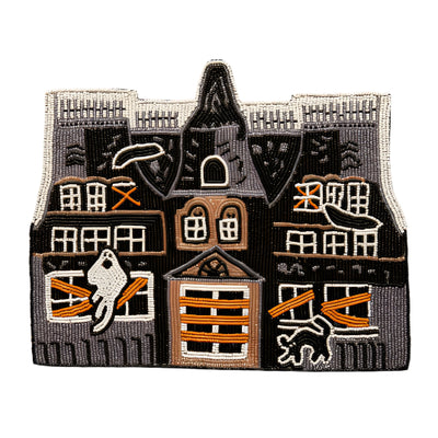 Bring spooky charm to your fall tablescape with our Haunted House Beaded Placemat, meticulously hand-sewn with thousands of shimmering glass beads. Featuring a haunted mansion silhouette, this placemat includes iconic Halloween details: ghosts, bats, cats, boarded windows, and eerie rooftops.