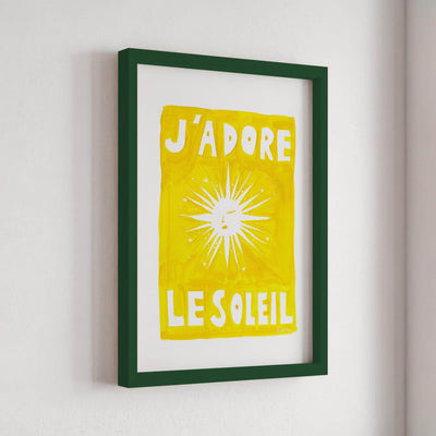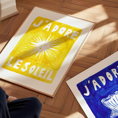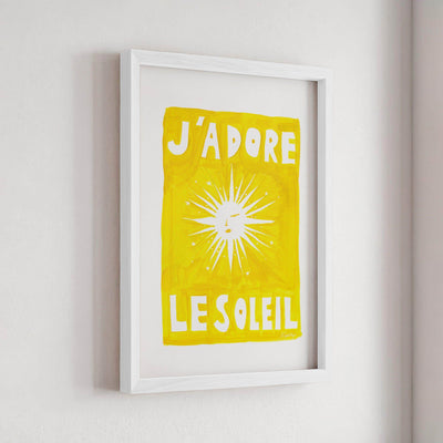 "J'adore le Soleil," meaning "I adore the sun" in French, is a bold handprinted print that embodies the sentiment of a love letter from the sun. Painted in a warm yellow, This print is designed to add a touch of the sunshine to your home.