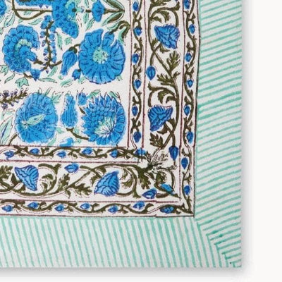 A floral print tablecloth with blue and green accents and green stripe border. Available in 3 sizes.