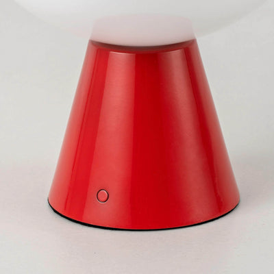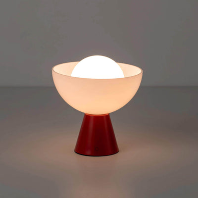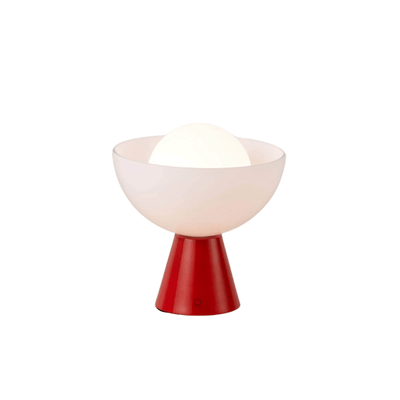 Stay ahead of the curve with our rechargeable glass dome table lamp. Proof that you can combine practicality and style, this cordless lamp is multi-functional, can be moved from room to room as the perfect lighting solution. The glowing glass shade set within a milky glass dome is balanced on a lacquered red base that can be transported around the home with you. Jam red is reminiscent of '80s and '90s design and we seek comfort in this.