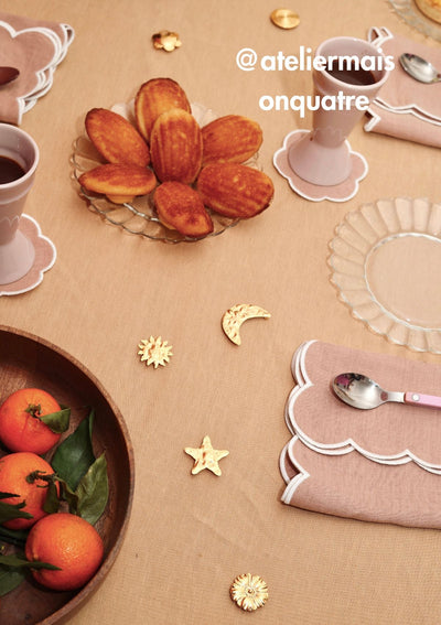 Set of 6 brass knife rests, entirely handmade and gilded with 24-carat gold in Paris. Each knife rest features a different motif (flower, spiral, buttercup, sun, moon and star). True jewels to decorate and protect your table. The gold plating keeps your knife rests impeccable over time. The rings do not open. Delivered in a pretty cotton pouch.