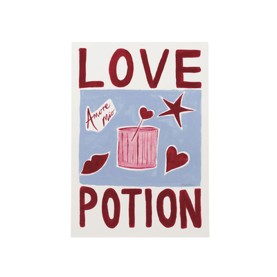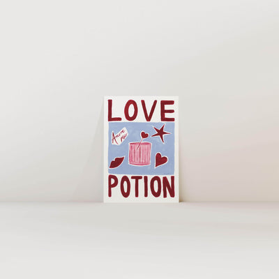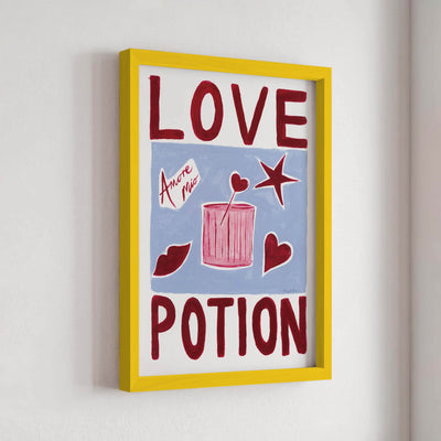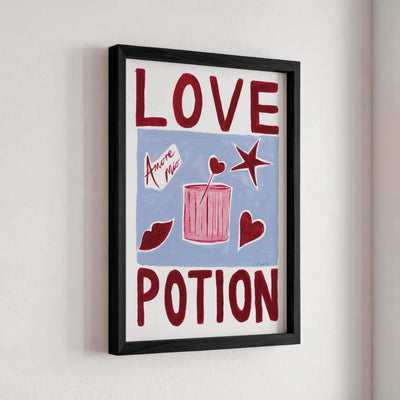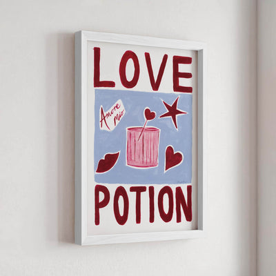 "Love Potion" - A playful, hand-painted acrylic artwork featuring bold red lettering and romantic symbols on a dreamy blue background. This 2025 Valentine's design combines retro charm with modern style. Ideal for year-round display, bringing love and personality to your walls while complementing both modern and vintage-inspired decor.