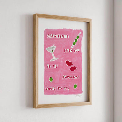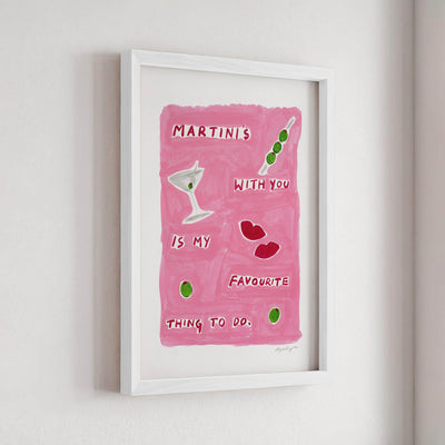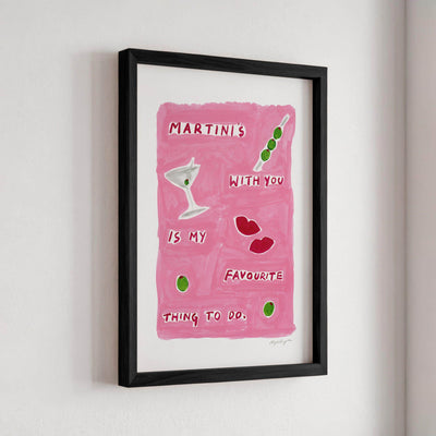 Introducing our print, "Martinis with You is My Favorite Thing to Do," featuring hand-painted olives, a martini glass, and Nephthys' signature lips. This piece celebrates the joy of shared moments over martinis, highlighting the beauty of friendship.