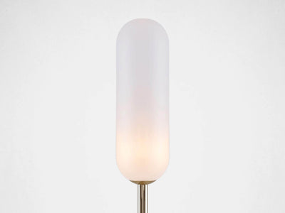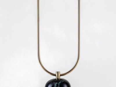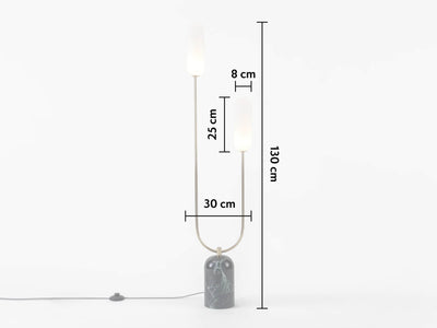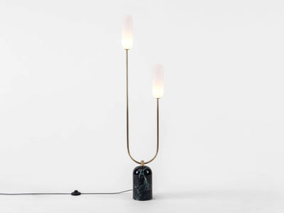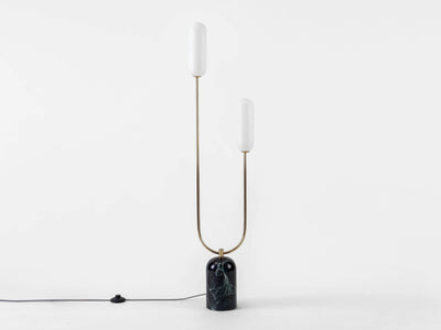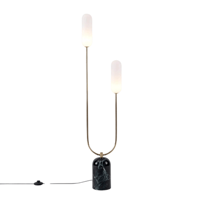 Transform your space with this opulent floor lamp. The sculpted green marble base mounts 2 curved brass arms, each topped with opal glass pill shades, which diffuse a warm illuminating glow. Ideal for a living room or dining space. Natural beauty, each cut of  houseof marble is absolutely unique. The geographic tone and gloss finish offers clean contrast to the brass metal frame.