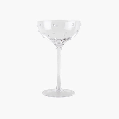 This classic clear coupe design features an elongated stem and a wide bowl hand-embellished with pearl detail, each piece carefully single-packed. Perfect for the socialite who values a stylish collection of glassware.