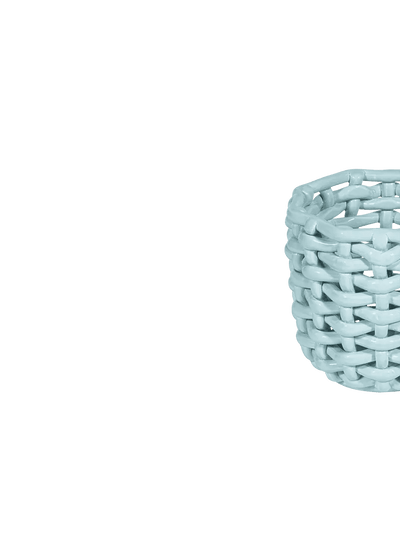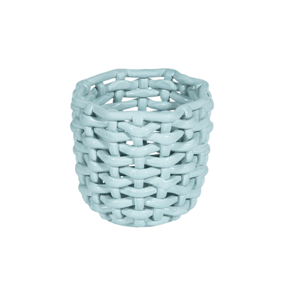 Handwoven sky blue ceramic basketweave pot. Use this glazed planter as a pot for your house plants or as a pot to hold anything around the house, from a kitchen utensils holder to storing paintbrushes or toothbrushes.