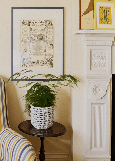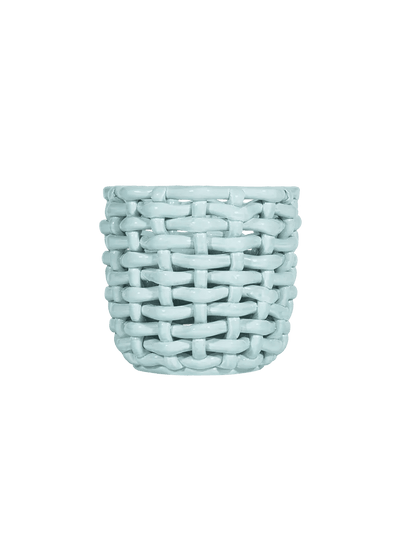 Handwoven sky blue ceramic basketweave pot. Use this glazed planter as a pot for your house plants or as a pot to hold anything around the house, from a kitchen utensils holder to storing paintbrushes or toothbrushes. Upgrade uninspiring plant pots and make your house plants a feature on a table or shelf. This piece is handwoven in Portugal using strips of clay by a highly skilled clay weaver. This time-honoured basketry technique is very rare and makers are hard to find. The final glazed result is a real showstopper. The planter can fit a plant pot up to 14.5cm in diameter. 18cm high. These products are completely handmade and therefore every piece is completely unique and may vary slightly in size or appearance. Please note that plants should be removed to be watered as the sides of the basket are not watertight.