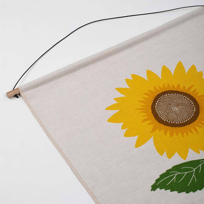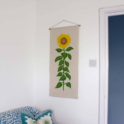 A charming yellow Sunflower fabric wall hanging, hand screen printed onto natural cotton linen with a lovely textural feel.