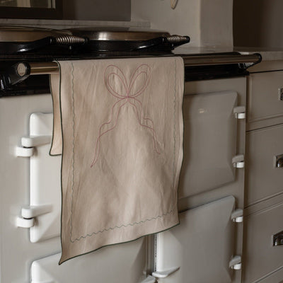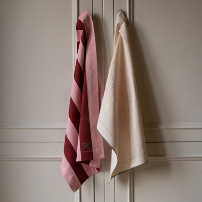 Add a festive touch to your kitchen with this Set of 2 Organic Cotton Christmas Tea Towels, crafted from 100% organic cotton. Designed with a playful pink and red stripe, dark green edging, and a delicate embroidered bow, these tea towels are as stylish as they are practical. Soft, absorbent, and finished with a hanging loop, they’re made to be used and loved year after year.