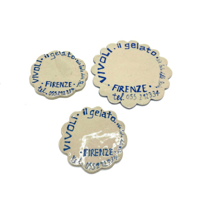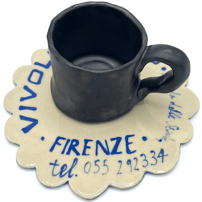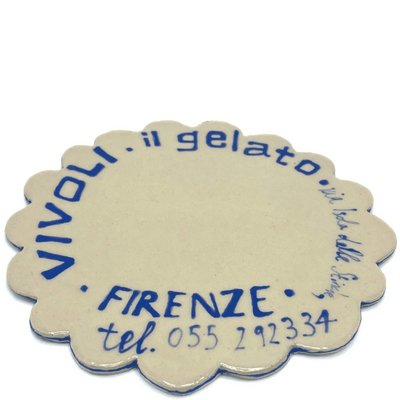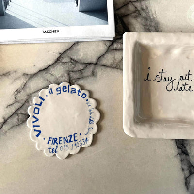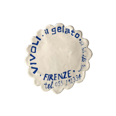 The Vivoli Coaster from L&Clay Ceramics features blue and turquoise underglaze text replicating a napkin from the famous Florentine Cafe; Vivoli.